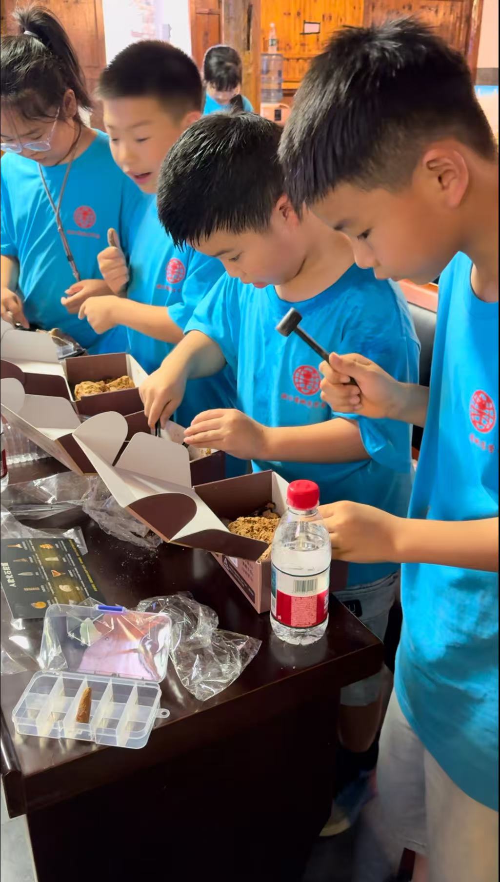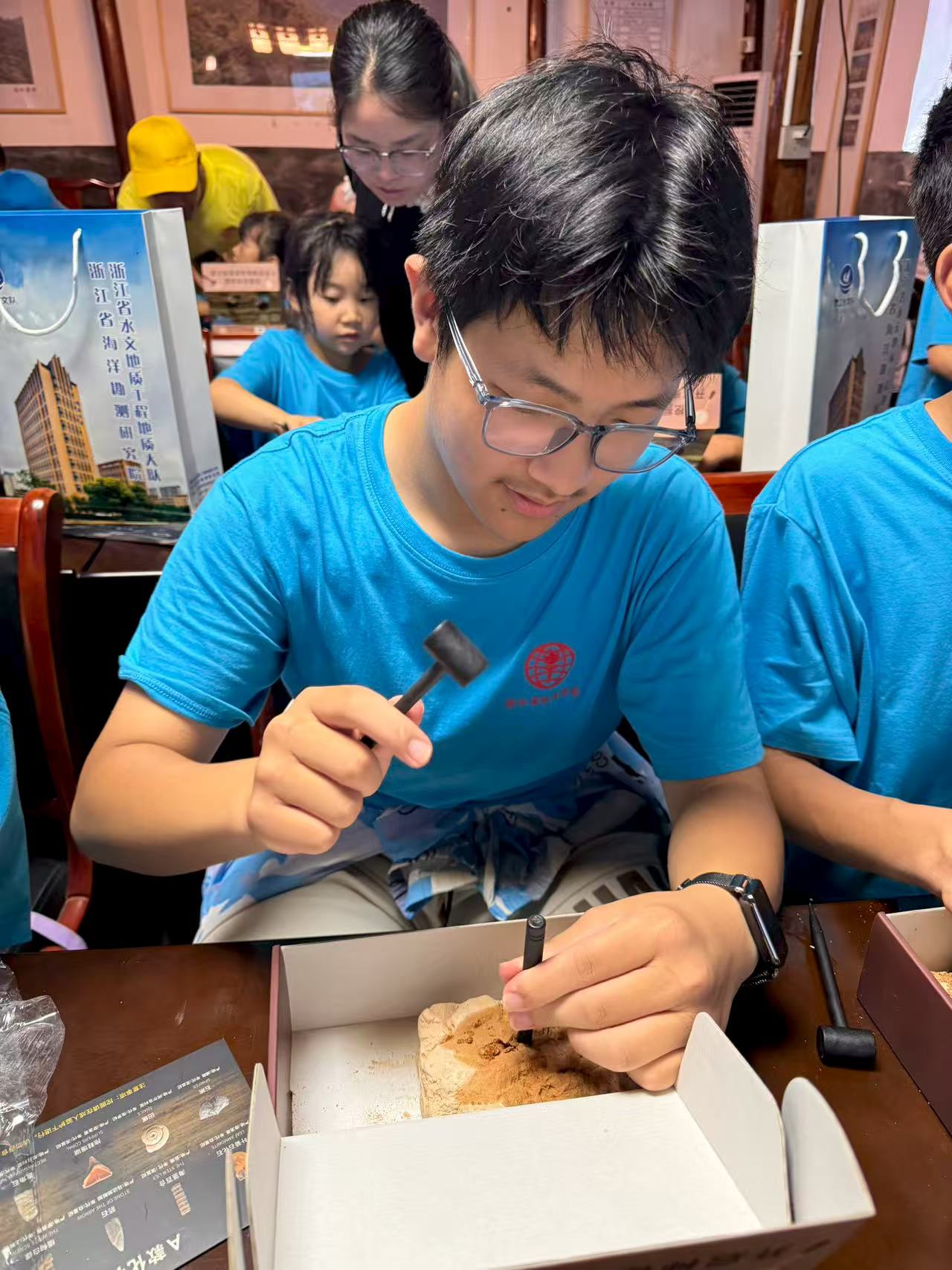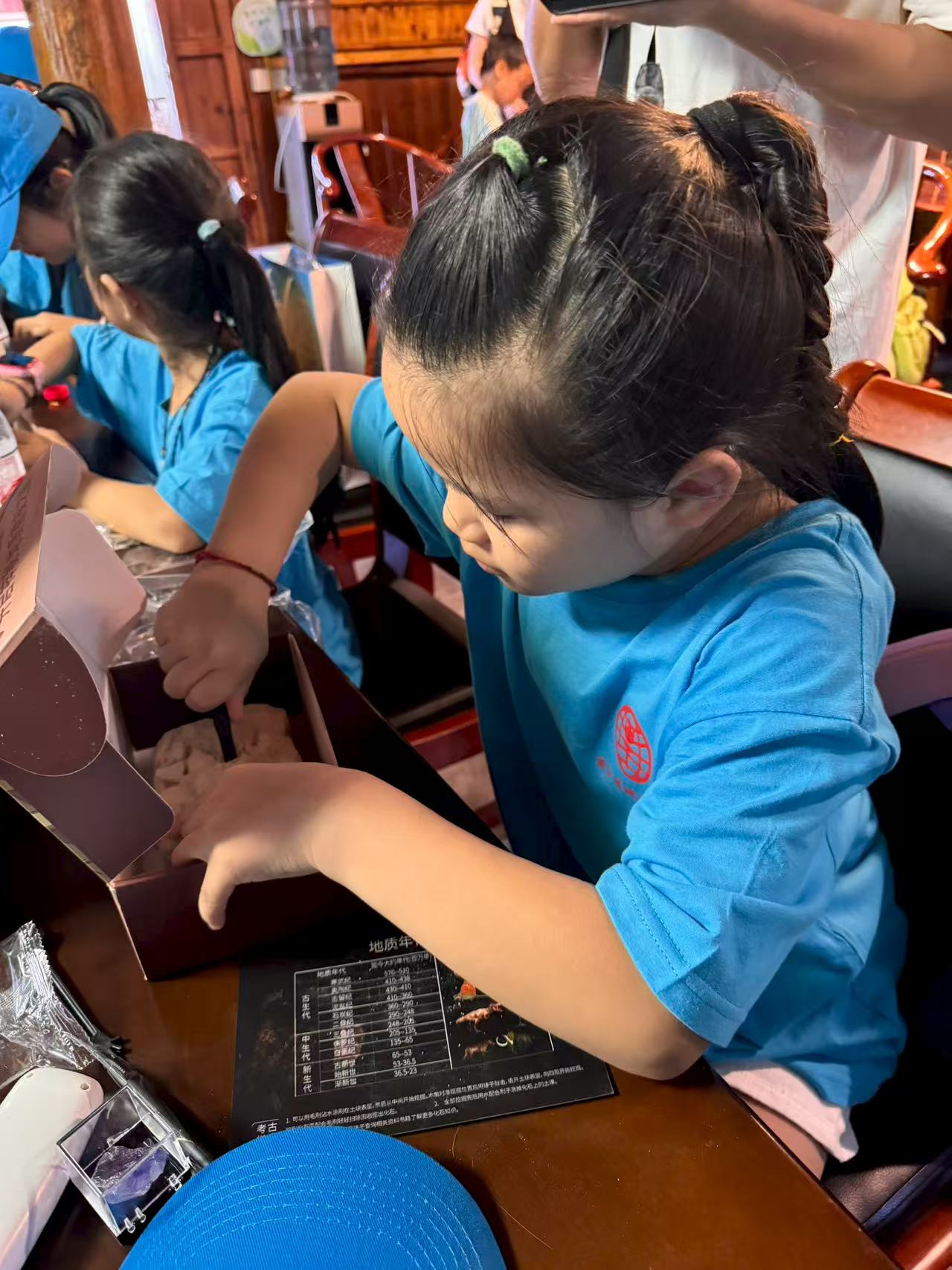 课后,一份特别的“惊喜”等待着营员们——亲手开启天然化石盲盒。 营员们兴致勃勃且又小心翼翼地剥离岩层,寻找潜藏其中的化石痕迹。 这份亲身体验,让营员们化身小小地质学家,切身感受地质研究的乐趣与探索的成就感。