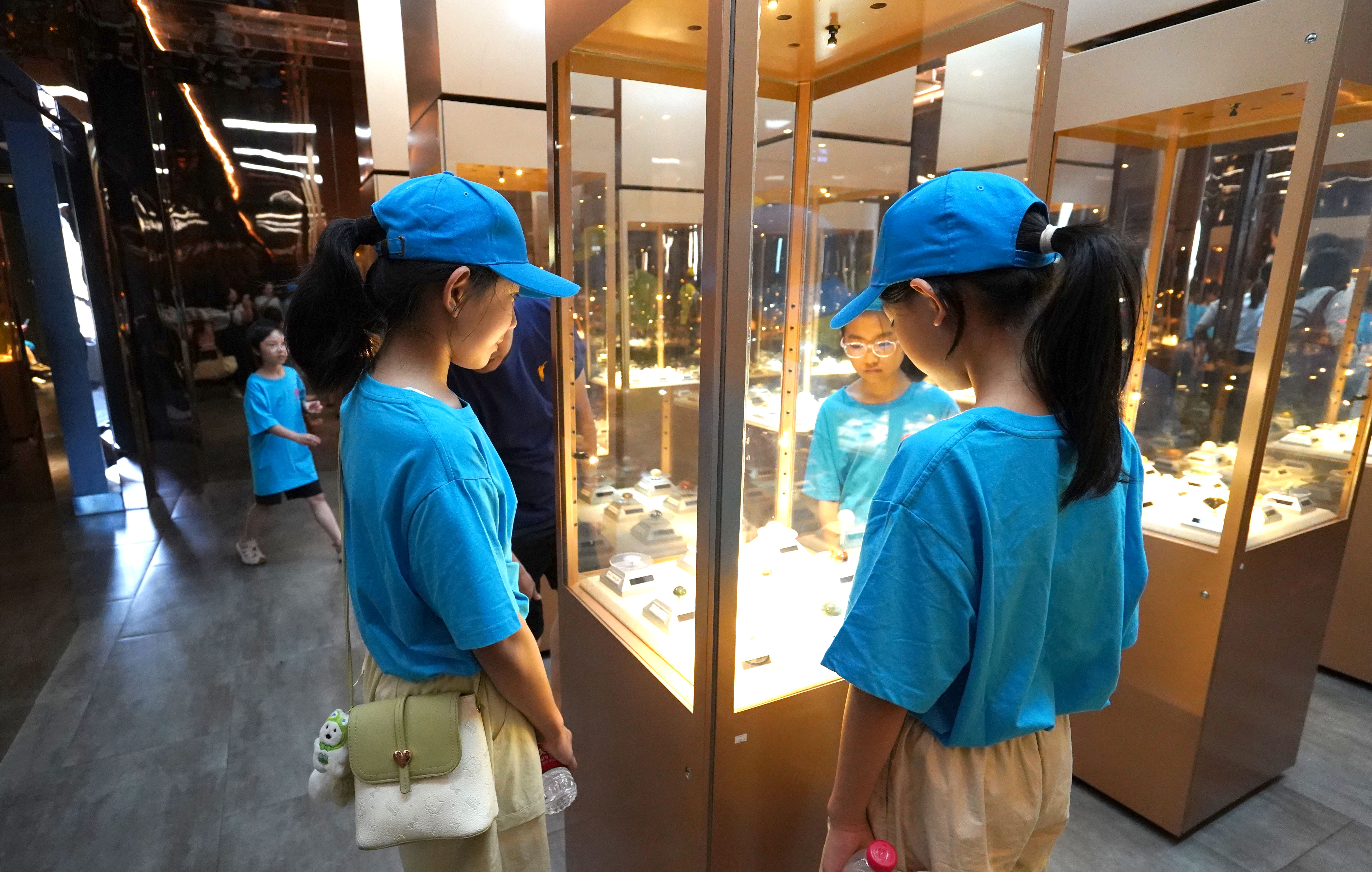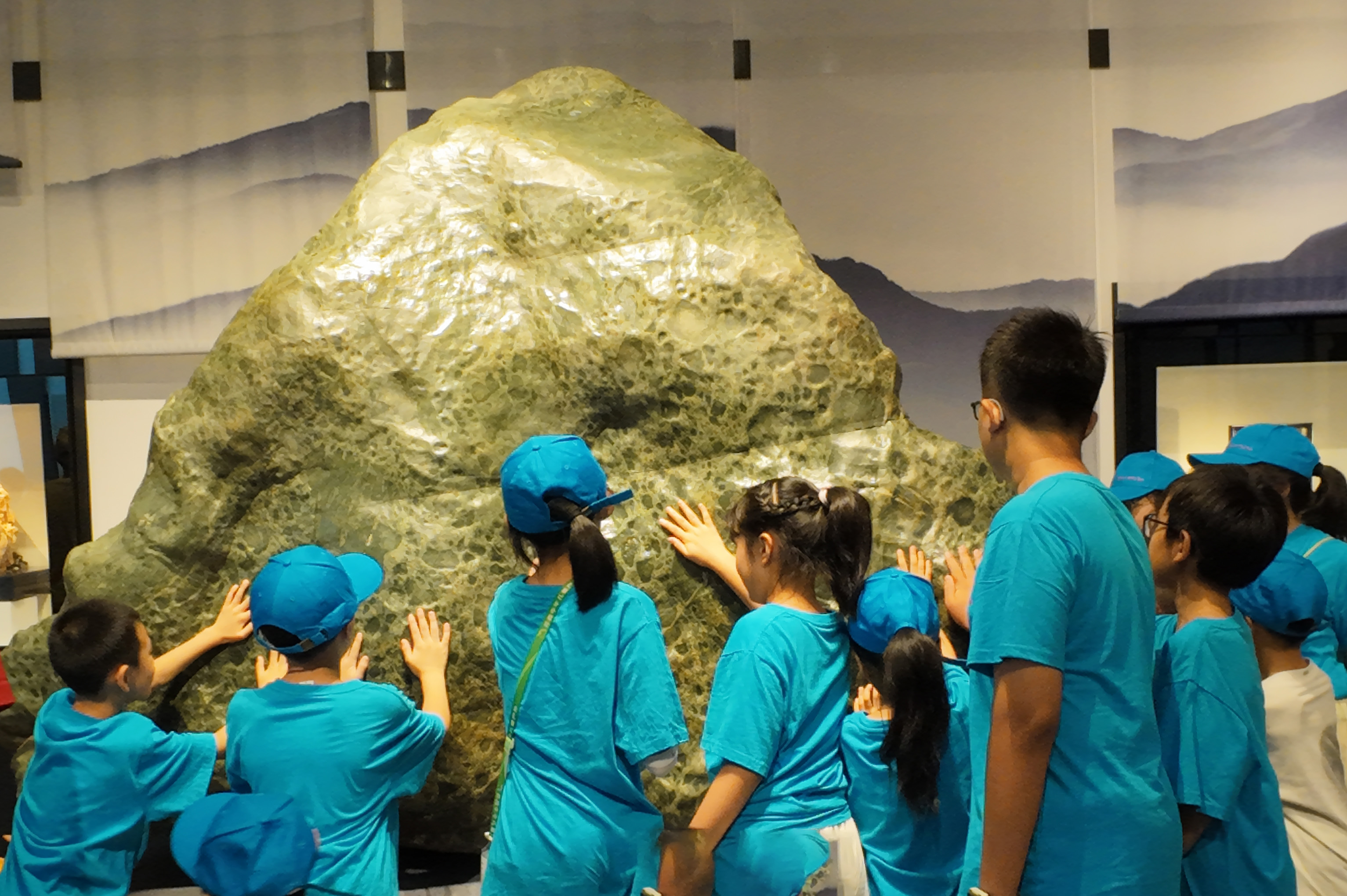活动首日,夏令营走进常山县青石镇中国观赏石博览馆。在讲解员的引导下,营员们参观了矿物晶体厅、岩石类观赏石厅、古生物化石厅。面对晶莹剔透的水晶、纹路奇异的观赏石以及承载远古生命印记的恐龙化石,营员们惊叹于大自然的鬼斧神工,纷纷围着讲解员追问, “这种石头是怎么形成的”“化石能告诉我们什么”。指导老师们结合展品,用通俗易懂的语言讲解地质演变原理与观赏石文化,让营员们在互动中解锁地质知识,感受大自然的神奇创造力。