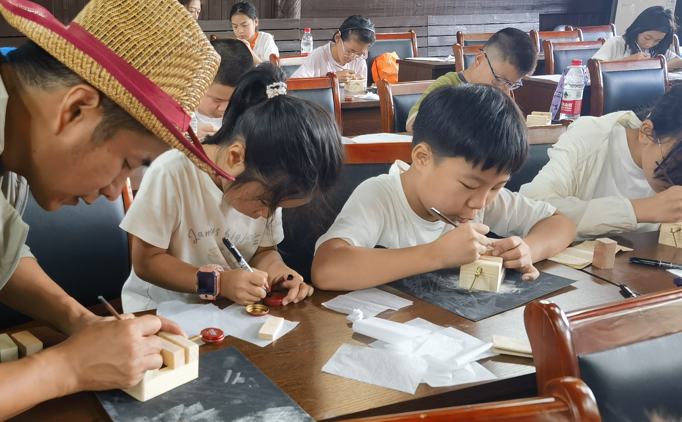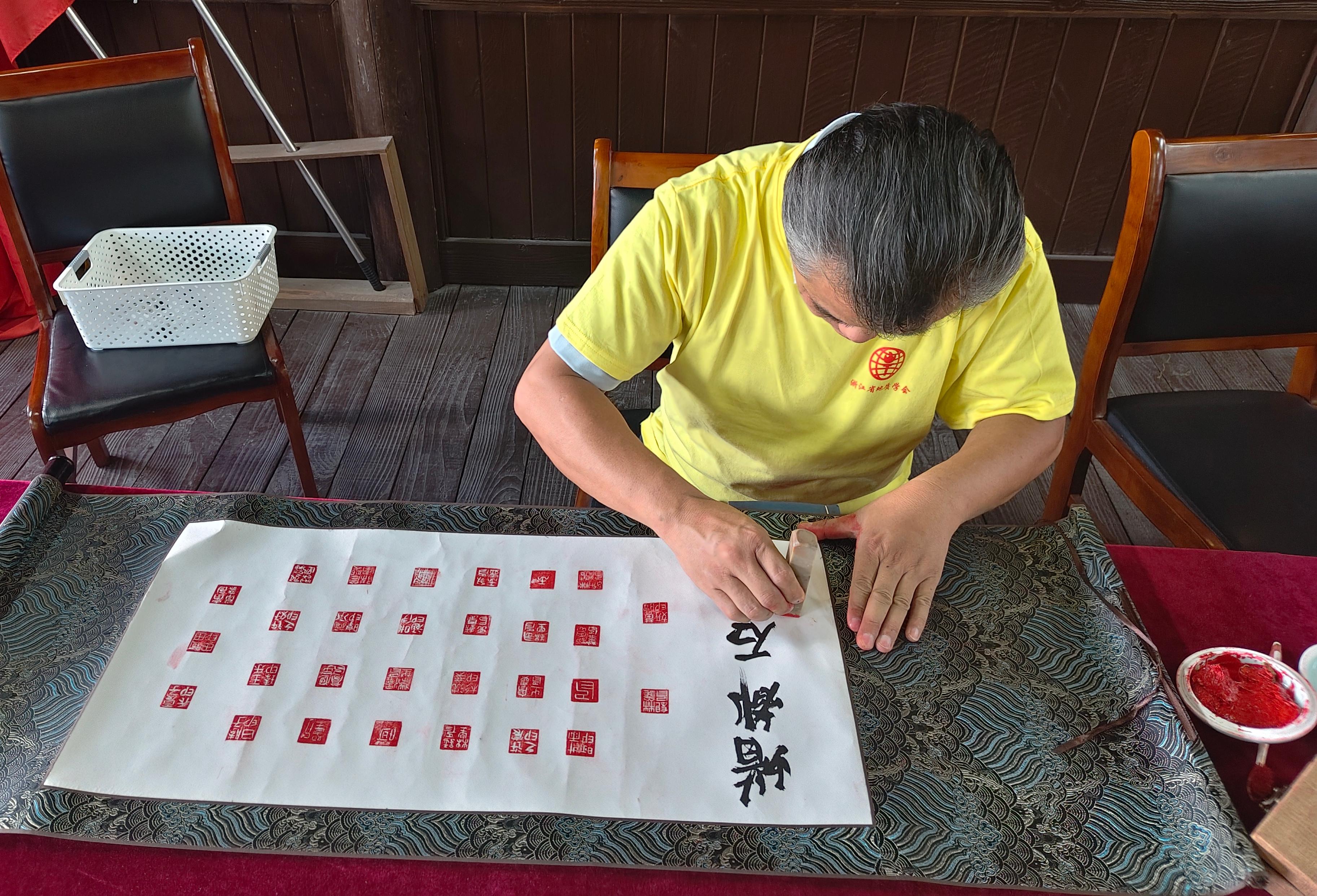 “泰顺叶蜡石雕刻”非遗代表传承人、高级工艺美术师王永贵为大家讲解叶蜡石石雕的“前世今生”,并指导小营员们从零基础入门印石篆刻,亲身体验从选石、打磨到刻印的完整过程。随后,营员们把课堂上自己完成的名章作品钤印于一幅卷轴之上,王永贵先生为该作品题词“蜡都石匠”,为石雕体验活动画上完满句号。